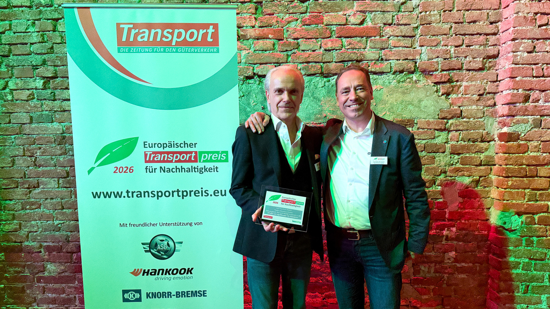 KRONE Trailer und Trailer Dynamics sind Gewinner des Europäischen Transportpreises für Nachhaltigkeit 2026 in der Kategorie „Trailer und Aufbauten“. Ausgezeichnet wurde der gemeinsam entwickelte eTrailer, ein elektrisch angetriebener Sattelauflieger, der den Straßengüterverkehr signifikant CO₂-effizienter macht. „Diese Auszeichnung bestätigt unsere Überzeugung, dass Nachhaltigkeit und Wirtschaftlichkeit Hand in Hand gehen können“, sagt Dr. Stefan Binnewies, Vorstandsmitglied der KRONE Holding. „Der eTrailer ist ein wichtiger Meilenstein auf dem Weg zu einem klimaneutralen Güterverkehr in Europa.“