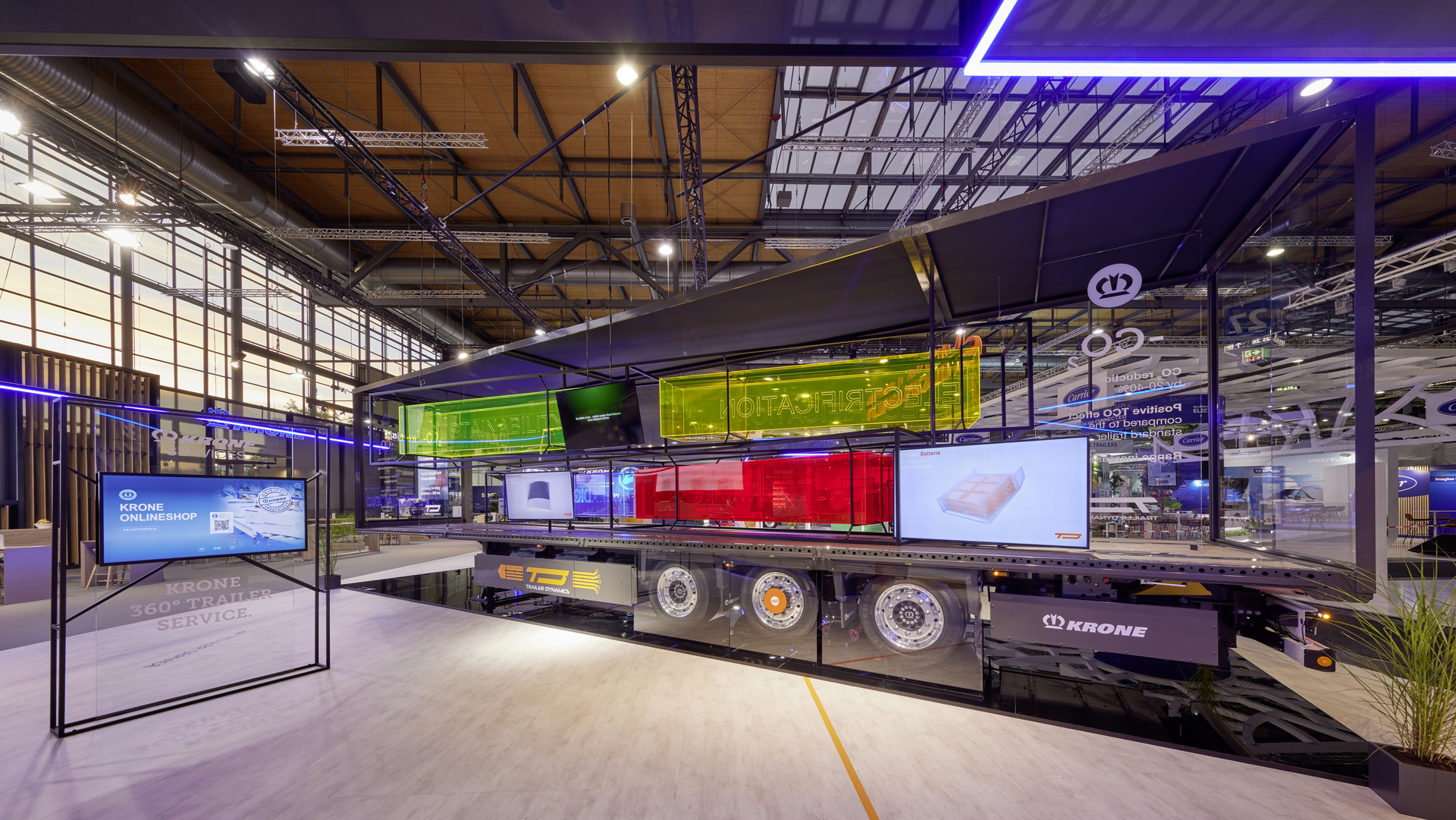 Mit dem eTrailer, den Krone gemeinsam mit Trailer Dynamics entwickelt hat, lässt sich der Dieselverbrauch und der CO2-Ausstoß der Sattelzugmaschine im Durchschnitt um 40 Prozent reduzieren. Das Kernstück der innovativen Technologie ist eine leistungsstarke eAchse. Sie unterstützt die Sattelzugmaschine im Antrieb und gewinnt zudem Bremsenergie durch Rekuperation zurück. Der Krone eTrailer bietet genügend Energie für Langstrecken über 500 km und kann mit jeder konventionellen Zugmaschine kombiniert werden, so dass sich die CO2-Reduktion direkt im Fuhrpark umsetzen lässt. Zu dieser Einsparung tragen auch die digitale Technologie der intelligenten Steuerung sowie die Automatisierung der Abläufe im Antriebsstrang des eTrailers erheblich bei.